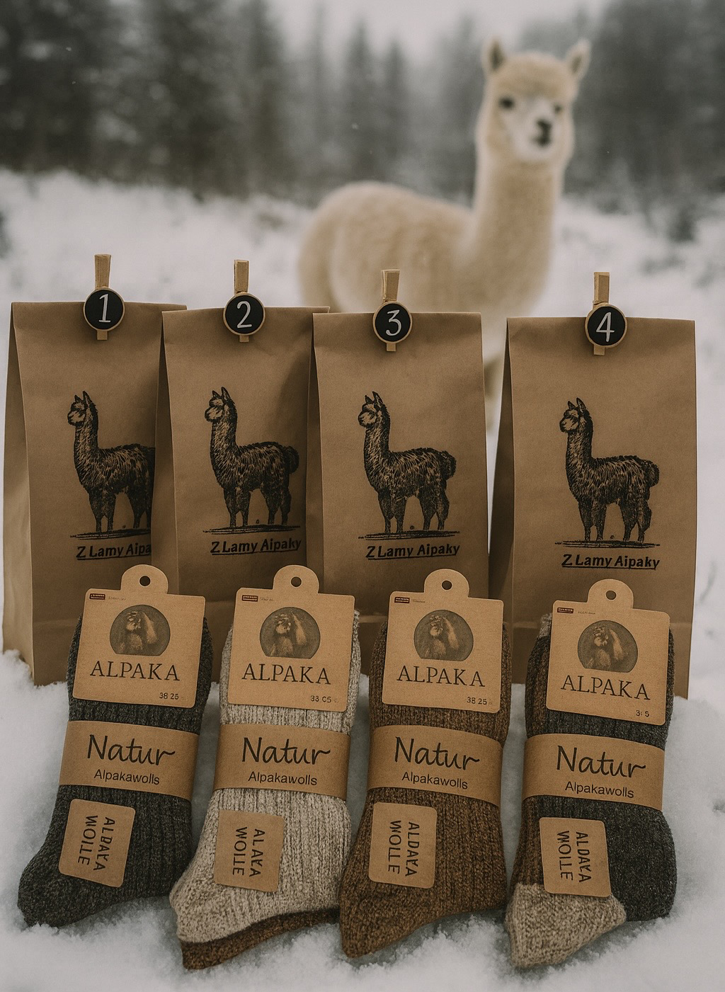 - 24 × ponožky z pravdej alpaka vlny v natural dizajne.