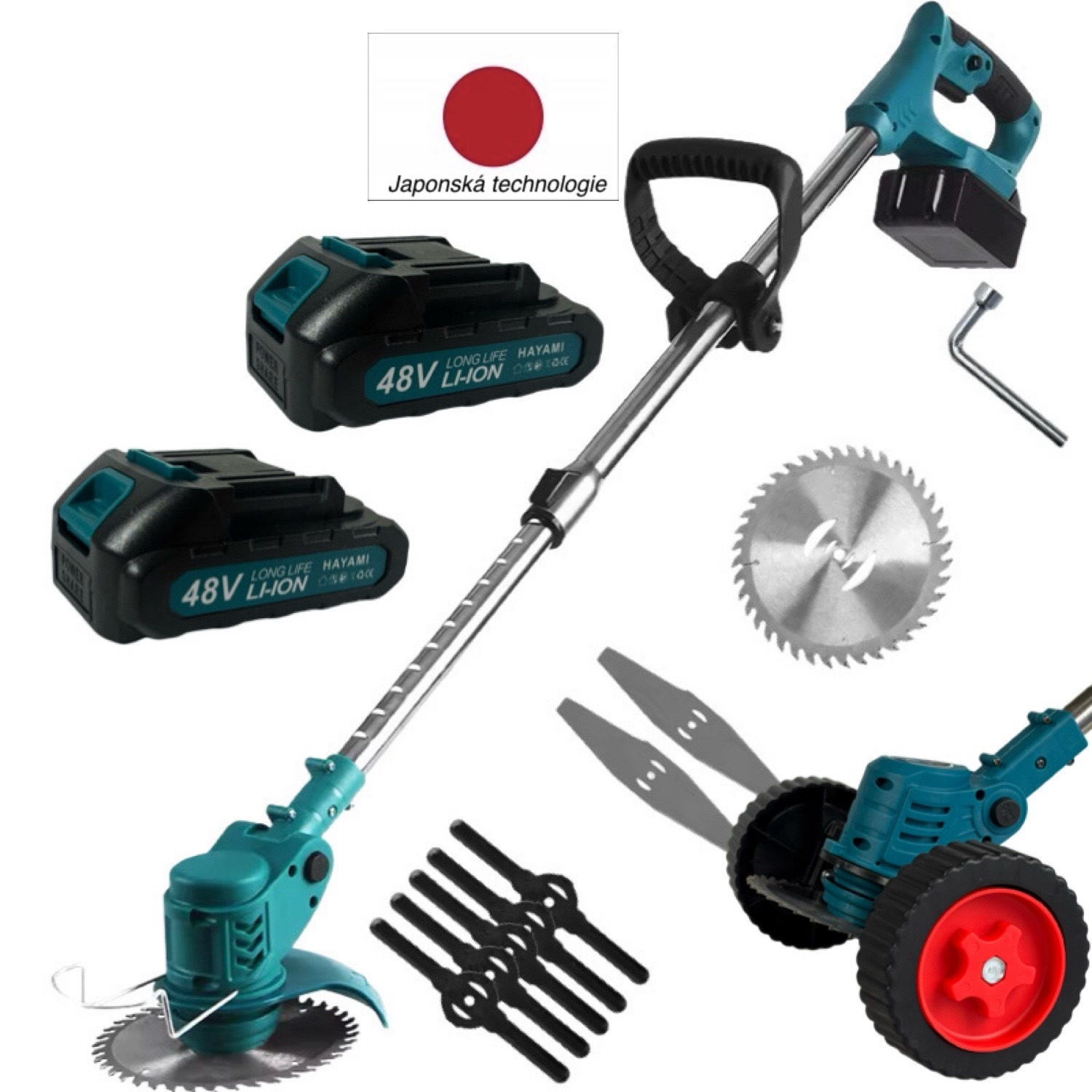 AKU krovinorez s kolieskami Hayami, kosačka, vyžínač 3v1 s príslušenstvom - 2x batéria 48V + 5x kosiace nože + 2x kosiace čepele + 1x kotúč