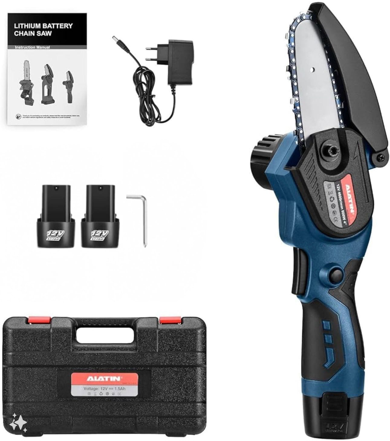 1x vrecková reťazová píla, 1x cestovný kufrík, 2x batéria, 1x nabíjačka, 1x servisný kľúč, 1x olej na reťaz, návod