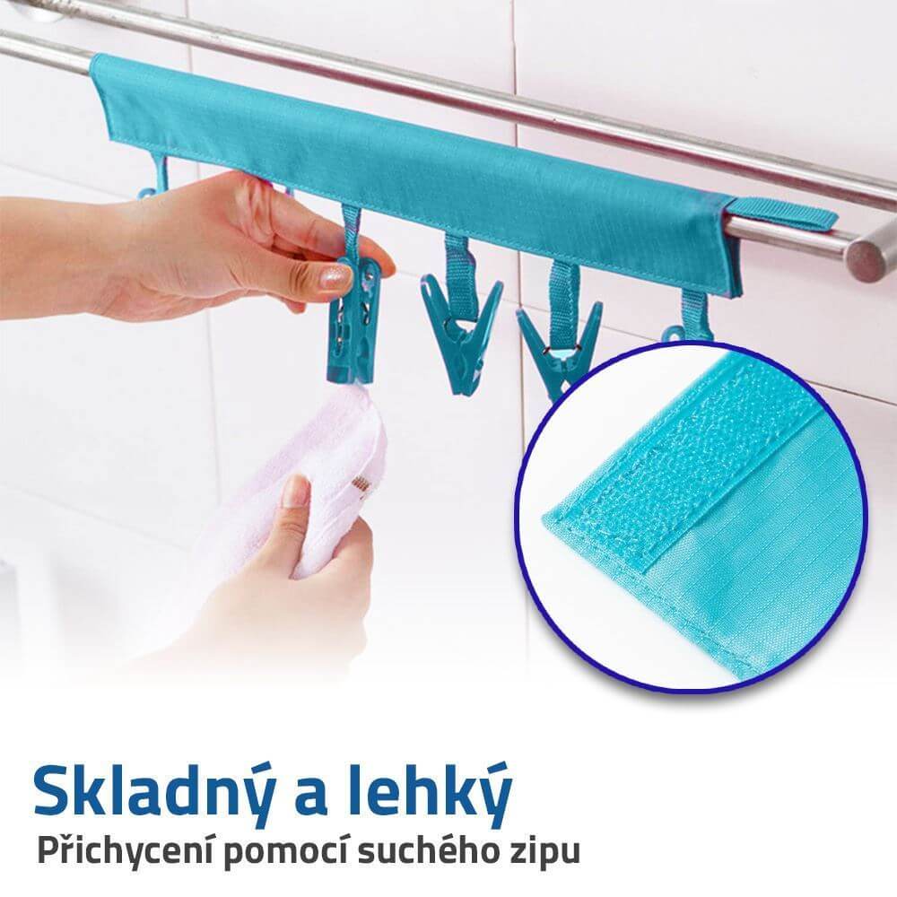 Usušte si oblečenie ľahko a rýchlo aj na dovolenke! Tento šikovný cestovný sušiak vám skvele pomôže. Nielen, že je jednoducho premiestniteľný, ľahký a skladný, ale jeho použitie je naozaj jednoduché. Pomocou suchého zipsu ho jednoducho prichytíte na nejaké madlo, ramienko, tyč, stoličku atď. Fantázii sa medze nekladú. Potom už stačí bielizeň navesiť na štipce a nechať preschnúť.