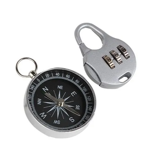 ZámokKvalitný kovový zámok na kufor s 3-miestnou kombináciou. Veľkosť zámku 5 cm x 3,5 cm.KompasS týmto kompasom sa nestratíte. Možno ho použiť na turistiku, kempovanie alebo aj ako základný nástroj na prežitie v núdzových situáciách. Priemer kompasu 4,5 cm.