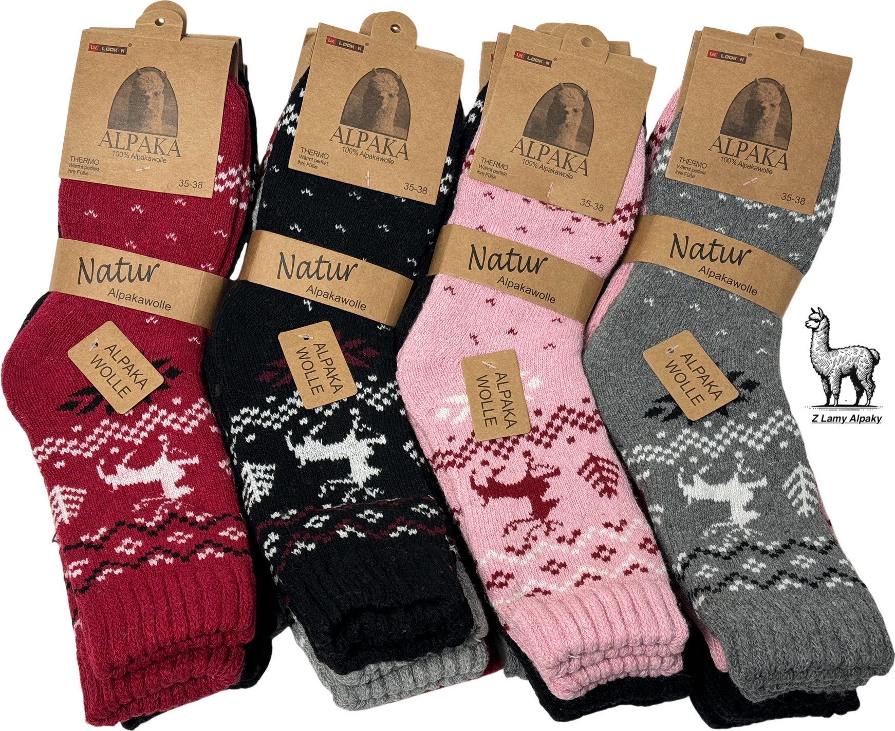 Teplé termo ponožky z alpačej vlny s vianočným vzorom sobov - mäkké, hrejivé a štýlové. Ideálne pre zimné obdobie, večery pri krbe aj vonkajšie aktivity. Materiál alpaka poskytuje prirodzenú tepelnú izoláciu a jemnosť. Perfektný darček alebo štýlový doplnok na každodenné nosenie v chladnom počasí.