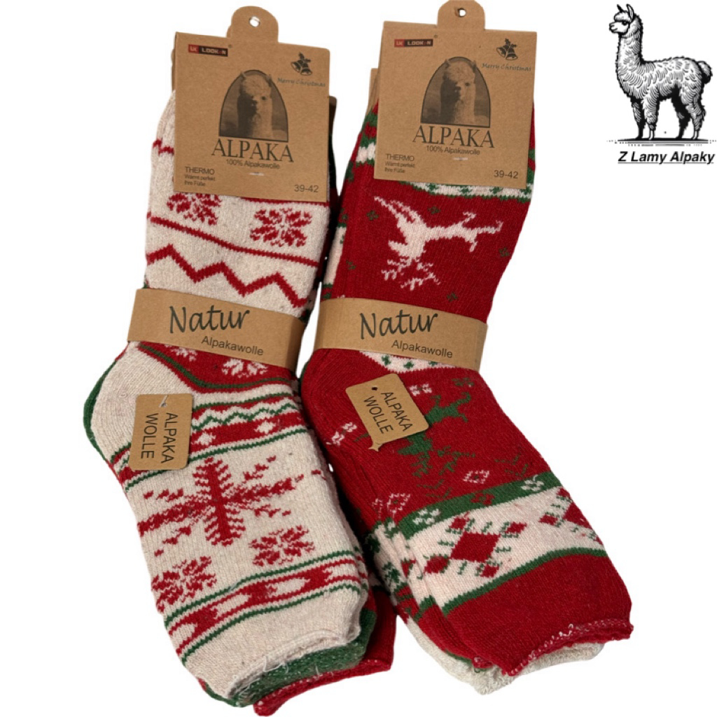 Teplé termo ponožky z alpačej vlny s vianočným vzorom sobov - mäkké, hrejivé a štýlové. Ideálne pre zimné obdobie, večery pri krbe aj vonkajšie aktivity. Materiál alpaka poskytuje prirodzenú tepelnú izoláciu a jemnosť. Perfektný darček alebo štýlový doplnok na každodenné nosenie v chladnom počasí.