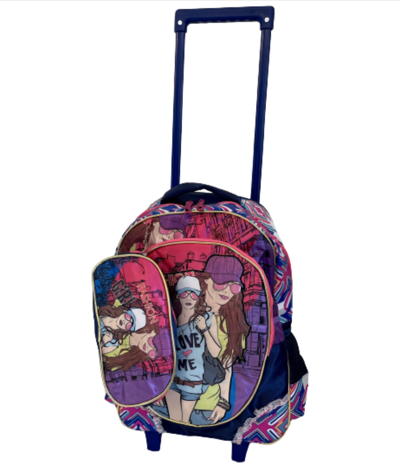Kufor / batoh na kolieskach s výsuvnou rukoväťou s vreckami na pitie po stranách a rôznymi vreckami na cenosti a pod. K tovaru take dostanete takú univerzálnu taštičku ktorá je možné použiť na kozmetiku alebo ako peračník do školy.