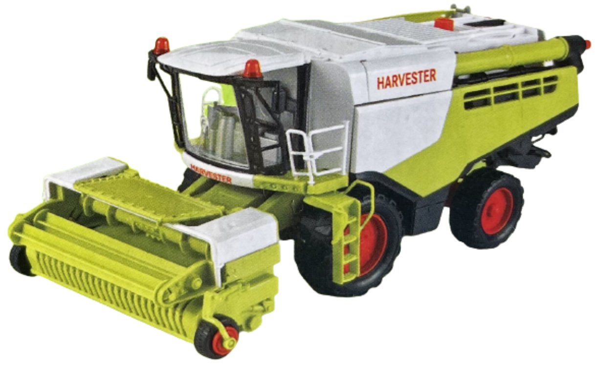 Detailně propracovaný kombajn s velkou přední radlicí je věrnou kopií opravdové zemědělské techniky.