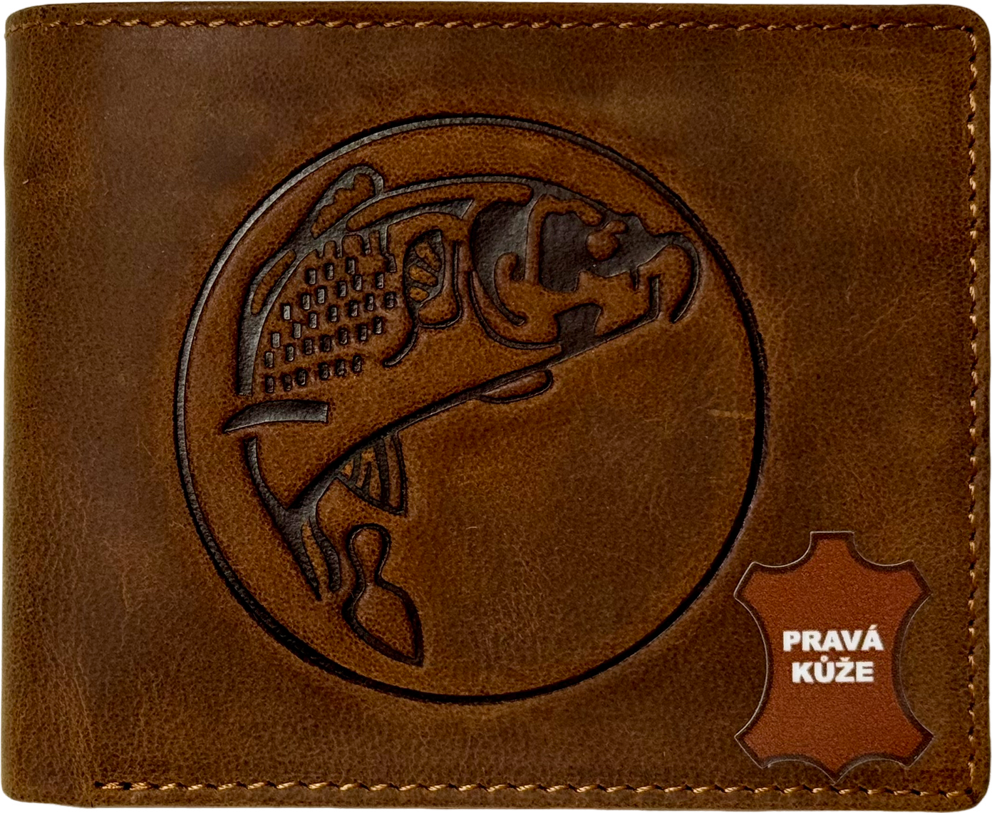 - Vypálený motiv kapra: Jedinečný symbol síly, štěstí a lásky k přírodě, který dodává peněžence osobitý charakter.