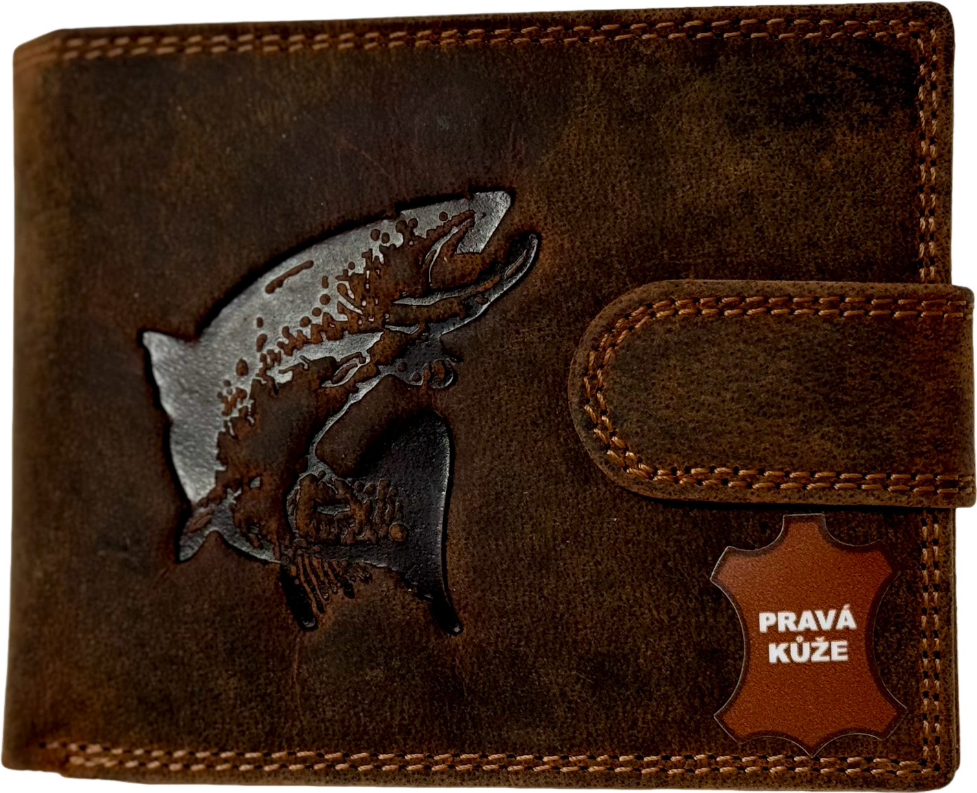 • Vypálený motiv štika: Jedinečný symbol síly, nezávislosti a lásky k přírodě, který dodává peněžence osobitý charakter.