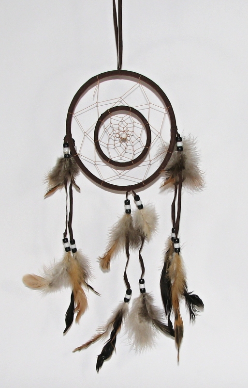 Stará indiánska povesť hovorí, že lapač snov dokáže triediť sny. Zlé uviaznu v sieti a sú zničené denným svetlom, dobré naopak skĺznu po pírkách do hlavy spáča. Z hľadiska Feng šuej lapač snov slúži ako ochranný symbol a regulátor prúdenia energie chi. použitie: Pre zamedzenie prílišnému úniku energie umiestnite do okna. Ako ochranný symbol zaveste nad posteľ. Pre spomalenie a rozptýlenie škodlivých energetických tokov zaveste do stredu miestnosti. Pre prilákanie čchi upevníte na stenu. Priemer kruhov 160 mm. Celková dĺžka 40cm. Materiál - bavlna, perie, koráliky.