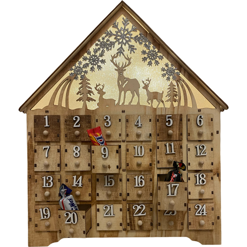 Drevený adventný kalendár má 24 drevených šuplíčkov, ktoré môžete naplniť drobnými darčekmi či sladkosťami. Dedinka je navyše osvetlená LED diódami, takže získate krásne osvetlenú dekoráciu, s ktorou čakanie na Vianoce bude zábava.