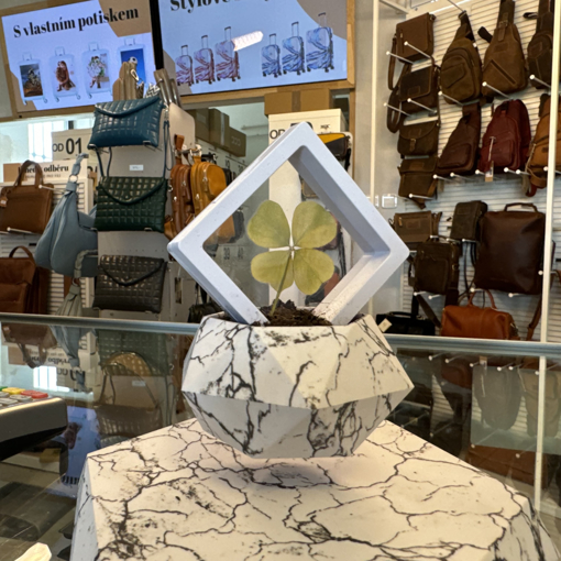 • Moderná dekorácia: Kombinácia minimalistického podstavca so štvorlístkom robí tento produkt ideálnym doplnkom do každého moderného interiéru.