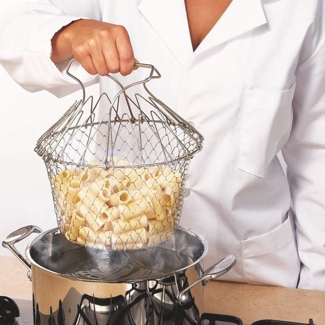 Nerezový košík pre každého profi kuchára, ale aj kuchára laika! S týmto košíkom pôjde varenie a príprava jedla oveľa ľahšie. Košík v sebe ukrýva nepostrádateľného pomocníka! Môžete ho využívať na niekoľko rôznych spôsobov. Napríklad na varenie na pare ako tzv. Parátko alebo ako cedidlo, kedy v ňom môžete preplachovať uvarené cestoviny, ale tiež ho môžete používať namiesto misy a dať do neho ovocie či zeleninu. Košík je vyrobený z kvalitnej nehrdzavejúcej ocele, ľahko sa skladá a zase rozkladá. Pokiaľ ho práve nebudete používať, tak v zloženom stave nezaberie skoro žiadne miesto! Tento kuchársky košík sa vám v kuchyni rozhodne nestratí!