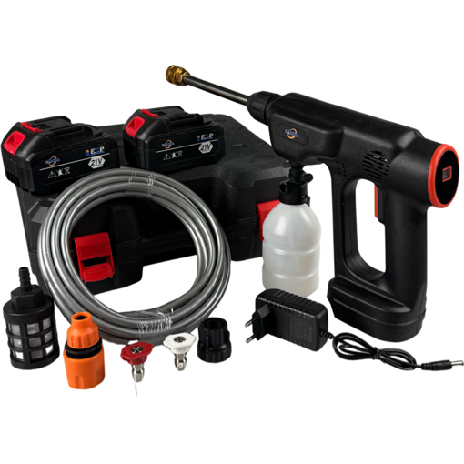 Súčasťou balenia je kompletná sada príslušenstva vrátane penovej nádoby, hadice, filtra, dvoch trysiek (0° a 40°), rýchlospojky, predlžovacej tyče a dvoch 21V batérií s kapacitou 3000mAh. Jedna batéria vydrží až 1 hodinu práce a vďaka rýchlemu nabíjaniu (3–4 hodiny) je zariadenie čoskoro opäť pripravené na použitie.