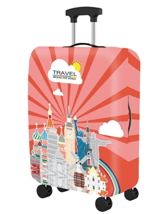 Balenie určené pre cestujúcich. Dizajn obsahuje biele ilustrácie svetoznámych pamiatok a architektúr na oranžovo-červenom pozadí s lúčmi vychádzajúcimi z horného stredu, kde sa nachádza symbol slnka a text "TRAVEL AROUND THE WORLD". Medzi pamiatkami môžeme vidieť Kremeľ, Eiffelovu vežu a Big Ben, čo naznačuje medzinárodného a dobrodružného ducha návrhu. Dole sa nachádza dúha, ktorá dotvára celkový veselý a optimistický dojem. Celkovo tento obal na kufor evokuje radosť z cestovania a objavovania nových miest.
