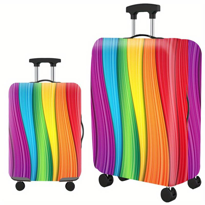 Obal s jasným a farebným dizajnom. Motív obsahuje súvislé farebné pruhy, ktoré prechádzajú celým obalom a vytvárajú dojem dynamického pohybu. Farebné pruhy majú gradient, ktorý sa mení z teplých oranžových tónov na chladné fialové, čo evokuje dúhu a symbolizuje rozmanitosť a radosť z cestovania. Dizajn je nápadný a určite upúta pozornosť na letisku alebo vo vlaku, vďaka čomu je kufor ľahko rozpoznateľný. Celkovo tento dizajn vyvoláva veselý a optimistický pocit, ktorý odráža vzrušenie a slobodu spojenú s objavovaním nových miest.