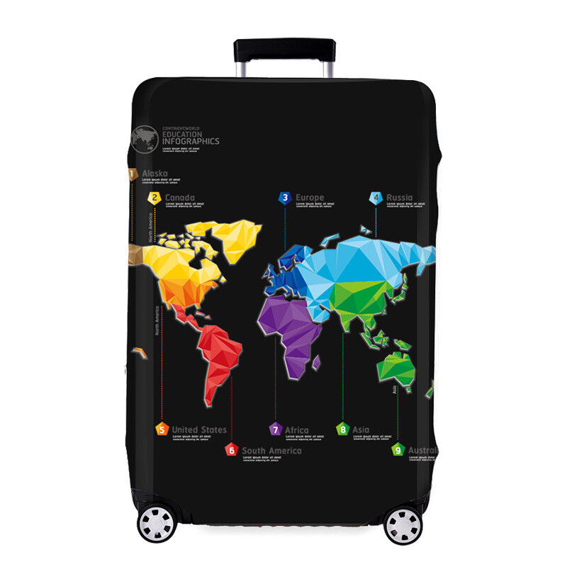 Tento obal na cestovný kufor má dizajn, ktorý pripomína farebnú politickú mapu sveta v abstraktnom geometrickom štýle. Farebné plochy zodpovedajú jednotlivým kontinentom alebo hlavným regiónom, ako sú Aljaška, Kanada, Spojené štáty, Južná Amerika, Afrika, Európa, Rusko, Ázia a Austrália.