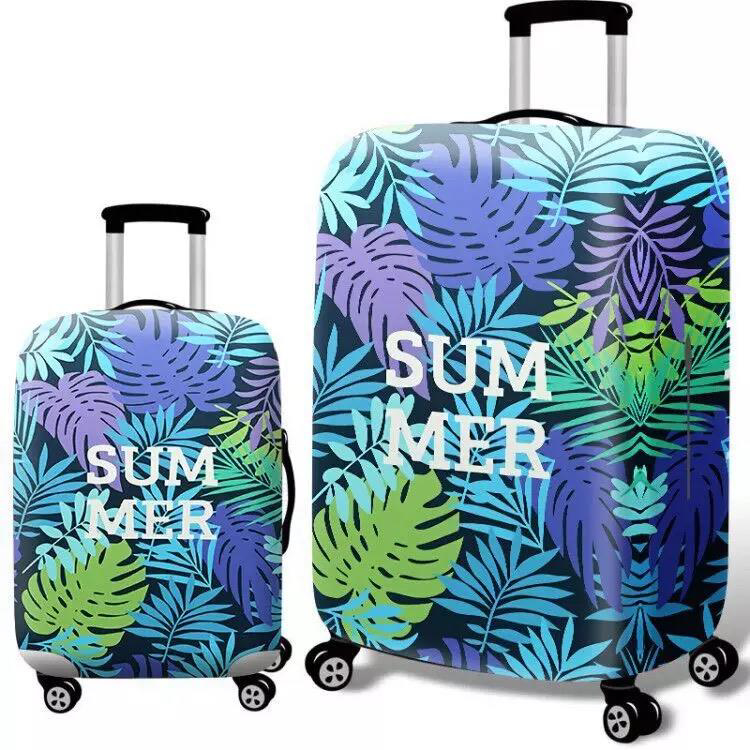 Obal na kufor s tropickým dizajnom. Hlavnými farbami sú rôzne odtiene modrej a zelenej, ktoré spolu vytvárajú pocit tropického lístia. Na obale je nápis "SUMMER", ktorý evokuje obdobie letných dovoleniek a oddychu.