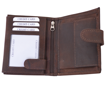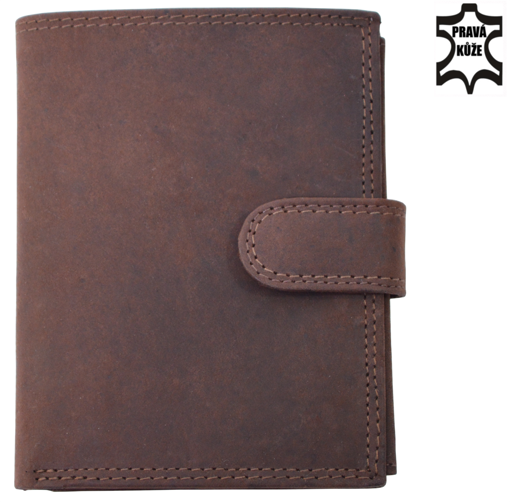 Kožená peňaženka z prírodnej pevnej hovädzej kože, brúsené leštené. Uzatvárateľná na patent. Bez nápisov a značiek. Rozmer: 12,5 x 9,5 x 2 cm. Občianka s veľkosťou 10,5 x 7,5 sa dovnútra vojde. Doklady: 4x Papierové bankovky: 2x Drobné mince: 1x Vizitky / kreditnej karty: 11x Ďalšie vrecko na zips vnútri: 1x