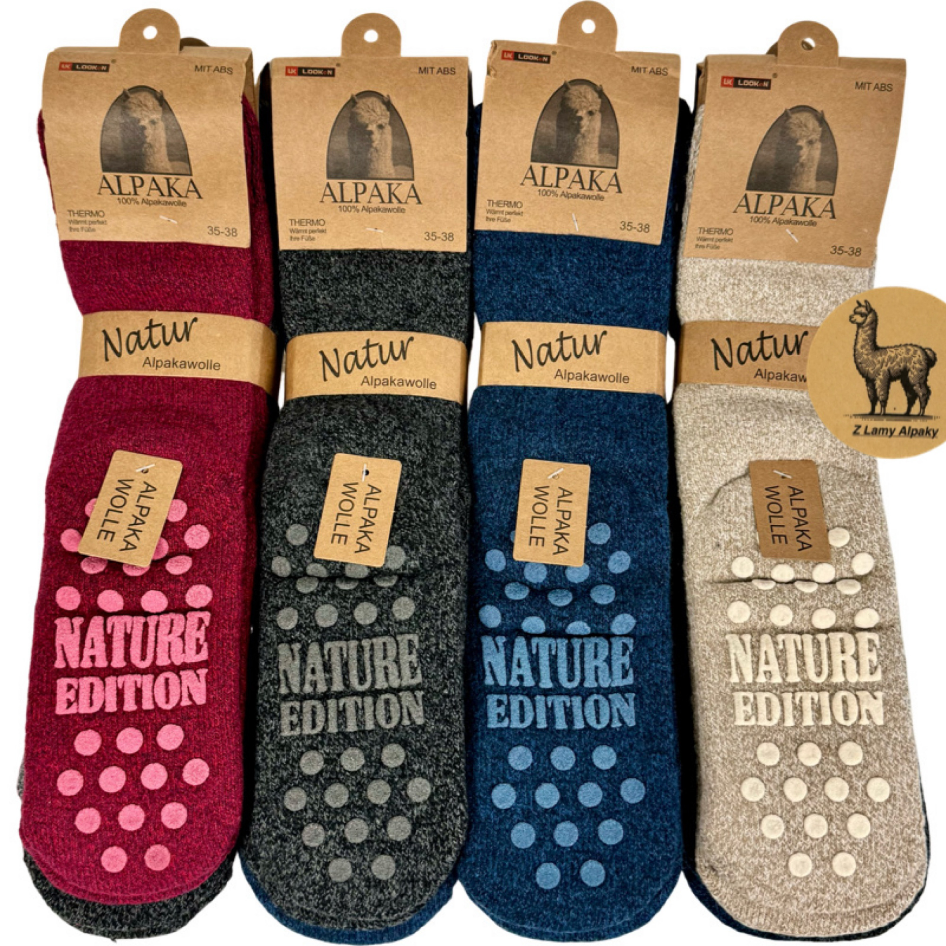 Dámske termo ponožky z 100 % alpaka vlny ponúkajú mimoriadnu hrejivosť, jemnosť a prirodzenú priedušnosť. Spodná strana má protišmykovú podrážku – gumové bodky zvyšujú istotu kroku na hladkých podlahách. Vďaka tomu netreba nosiť papuče – stačí obuť tieto ponožky a užívať si teplo aj bezpečie doma.