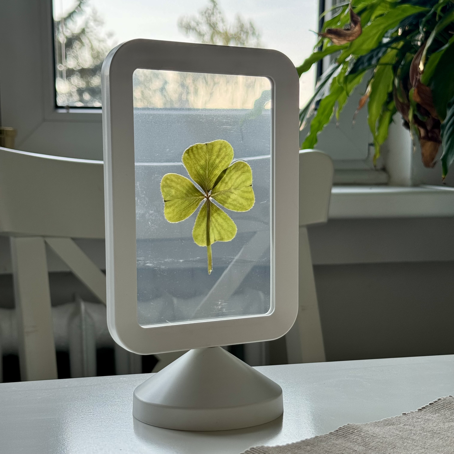 Pravý levitující čtyřlístek pro štěstí velký v rámu se stojánkem