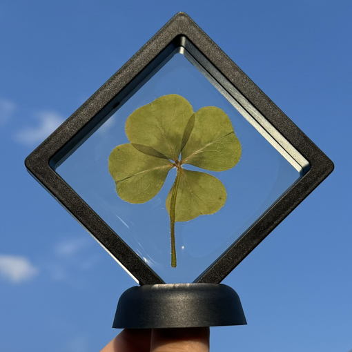 Pravý levitujúci štvorlístok pre šťastie vo veľkom rámčeku so stojanom
