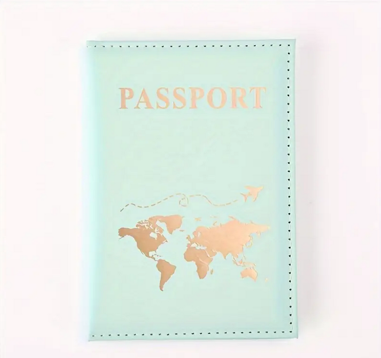 Cestovné puzdro na pas a dokumenty s nápisom "PASSPORT" zlatým písmom hore s vyrytým dizajnom svetovej mapy.