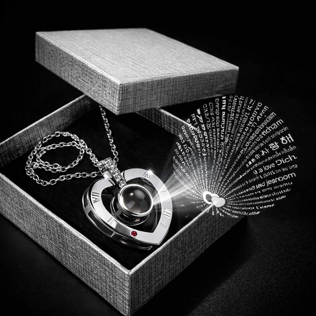 Elegantný náhrdelník so srdiečkovým príveskom ukrýva romantické vyznanie „Milujem Ťa“ v 100 rôznych jazykoch. Skrytý text sa zobrazí pri presvietení kamienka svetlom z mobilu. Dodávané v elegantnej striebornej darčekovej krabičke – ideálny darček k výročiu, Valentínu aj narodeninám.