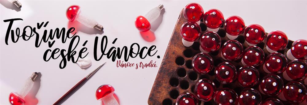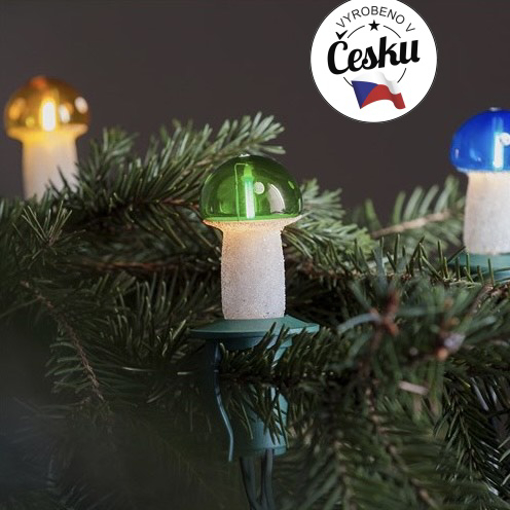 Tradičná česká osvetľovacia súprava so sklenenými žiarovkami Muchotrávek. Česká ručná výroba, nadväzujúca na výrobu vianočných súprav Heliand od roku 1946 v Piešťanoch.