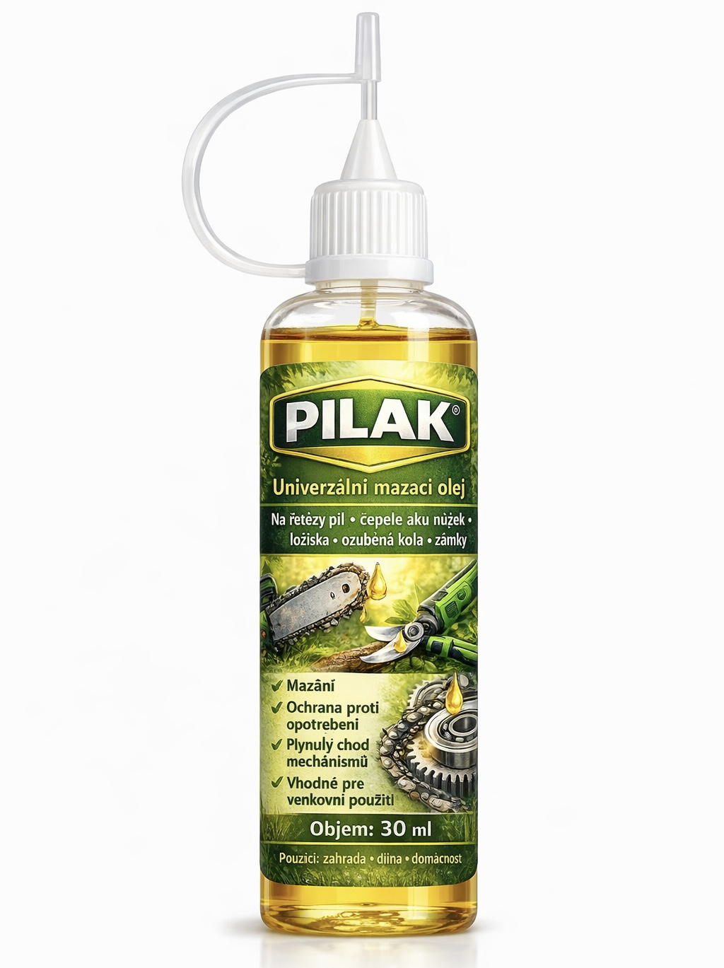 Aplikujte malé množství oleje přímo na řetěz, lištu nebo čepel. Pro maximální účinek doporučujeme mazání po vyčištění nástroje nebo před delším skladováním.