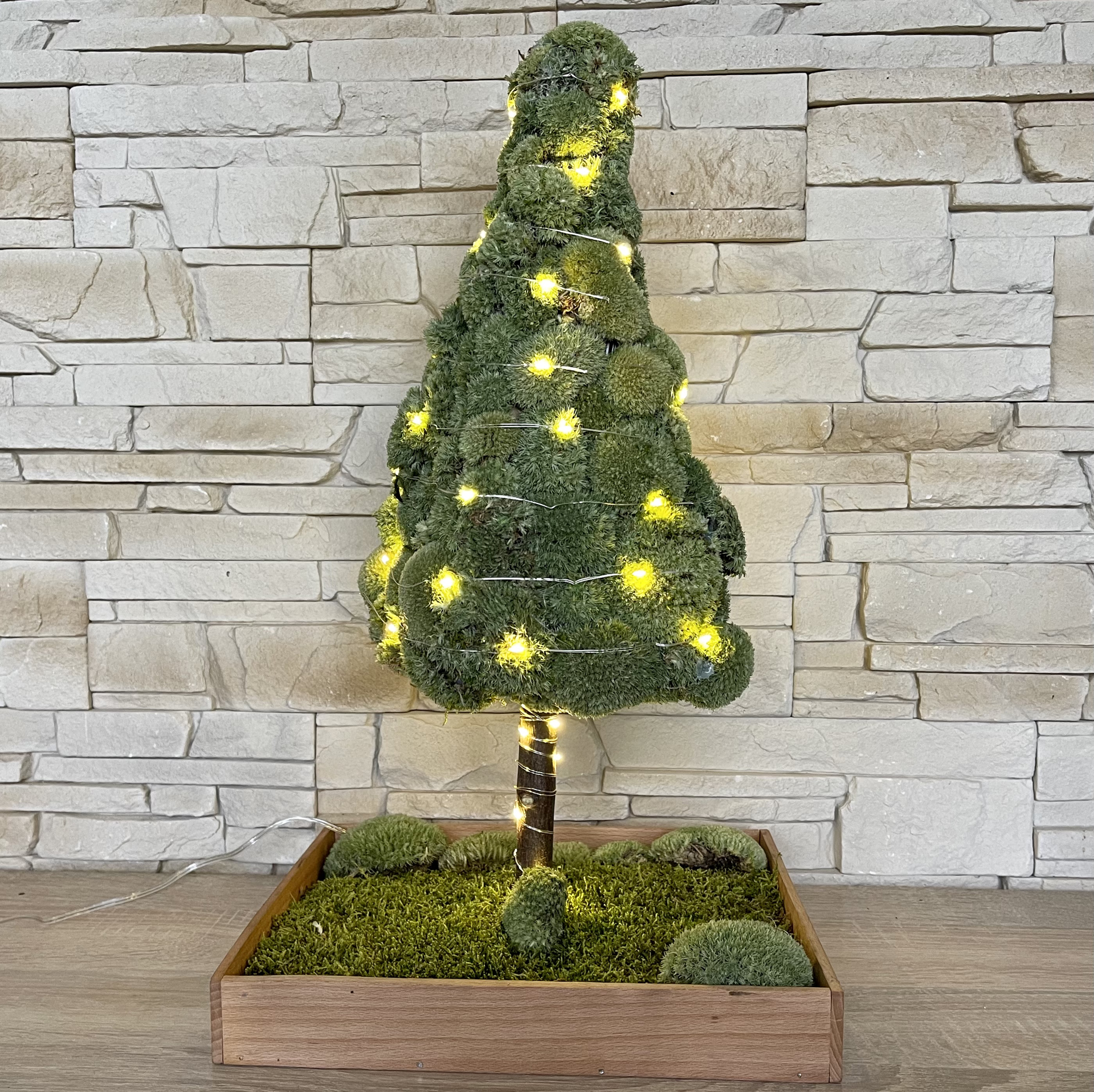 Obsah balenia: strom zo stabilizovaného machu na drevené podstavci so záhradkou, s Nano / Led vianočným osvetlením 50ks / 5m na 3 tužkové AA batérie.