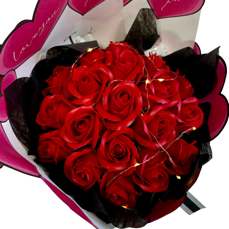 Prekvapte svoju lásku darom, ktorý hovorí priamo k srdcu! Táto nádherná kytica z 19 mydlových ruží je symbolom vašej nekonečnej lásky a romantiky. Každá ruža je jemne vyrezaná z voňavého mydla, ktoré pripomína čerstvo rozkvitnuté kvety. Aby bola atmosféra ešte kúzelnejšia, kytica je doplnená jemným LED osvetlením v teplej bielej farbe, ktoré vytvára intímne a romantické svetlo.