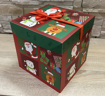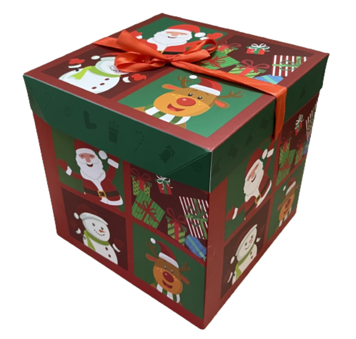 Překvapte své blízké dokonale zabaleným dárkem. Praktická vánoční krabička má veselý barevný potisk a skládá se z dna, víka a široké červené mašle. Dodáváme v rozloženém stavu, složíte jí jednoduše bez použití spojovacích materiálů: otevřením krabičky do sebe zapadnou vyseknuté zámky dna, jednoduché rozložení bočních klop vytvoří víko. Saténová stuha je připevněna na protilehlých stranách krabičky a převázaná přes víčko pevně uzavře krabičku. Krabička je opakovatelně otevíratelná.