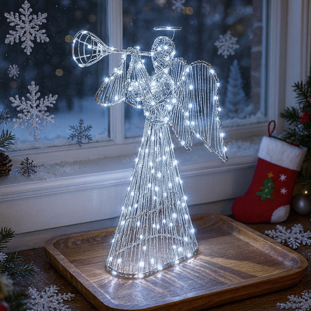 Elegantní kovový LED anděl s trumpetou je navržen jako výrazná vánoční dekorace pro exteriér i interiér. Pevná drátěná konstrukce v luxusním zlatém nebo stříbrném provedení je propletená 50 úspornými LED diodami, které rovnoměrně prosvětlí siluetu anděla a vytvoří slavnostní záři.