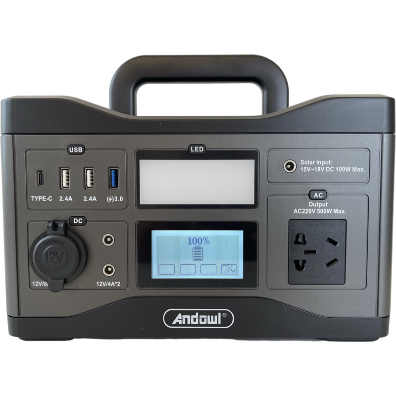 Prenosná elektráreň Andowl Q-CN600 600W 533Wh s AC/DC/USB/nabíjačkou do auta pre vonkajšie ale aj domáci núdzový zdroj elektrickej energie. Prenosná preto že váži iba 6kg a má kvalitné madlo. Solárny generátor elektriny s powerbankou / batériou môže byť poháňaný alebo ak chcete napájaný buď trvalo solárnym panelom, alebo aj možno použiť priloženú nabíjačku a len nabiť batériu pred odchodom na chatu, na dovolenku a podobne. Často býva označovaný aj ako agregát, solárny agregát, solargenerátor, centrála, alebo solárna elektrocentrála s batériou. Slúži na výrobu elektrickej energie v miestach, kde nie je dostupný elektrický prúd, alebo ako záložný zdroj energie pre pohon a prevádzku rôznych elektrozariadení. Na napájanie spotrebičov, ako sú žiarovky alebo jednoduché stroje s elektromotorom (vŕtačky a pod.)