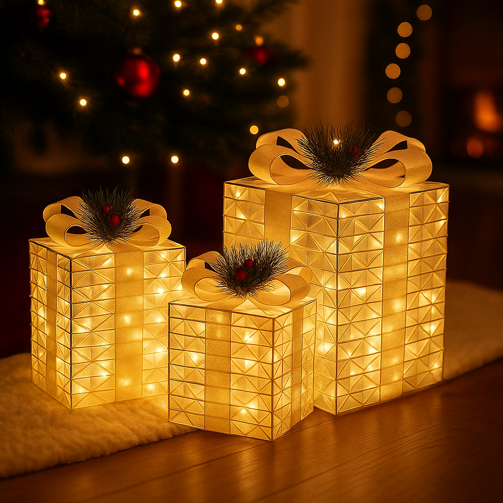Tri elegantné holografické darčeky s jemným svetlom 120 LED premenia každý kút na rozprávkovú scénu. Vďaka krytiu IP44 si ich užijete v obývačke aj vonku na krytom mieste – pri vchode, na terase alebo vo výklade. Stačí zapojiť a nechať Vianoce začať.